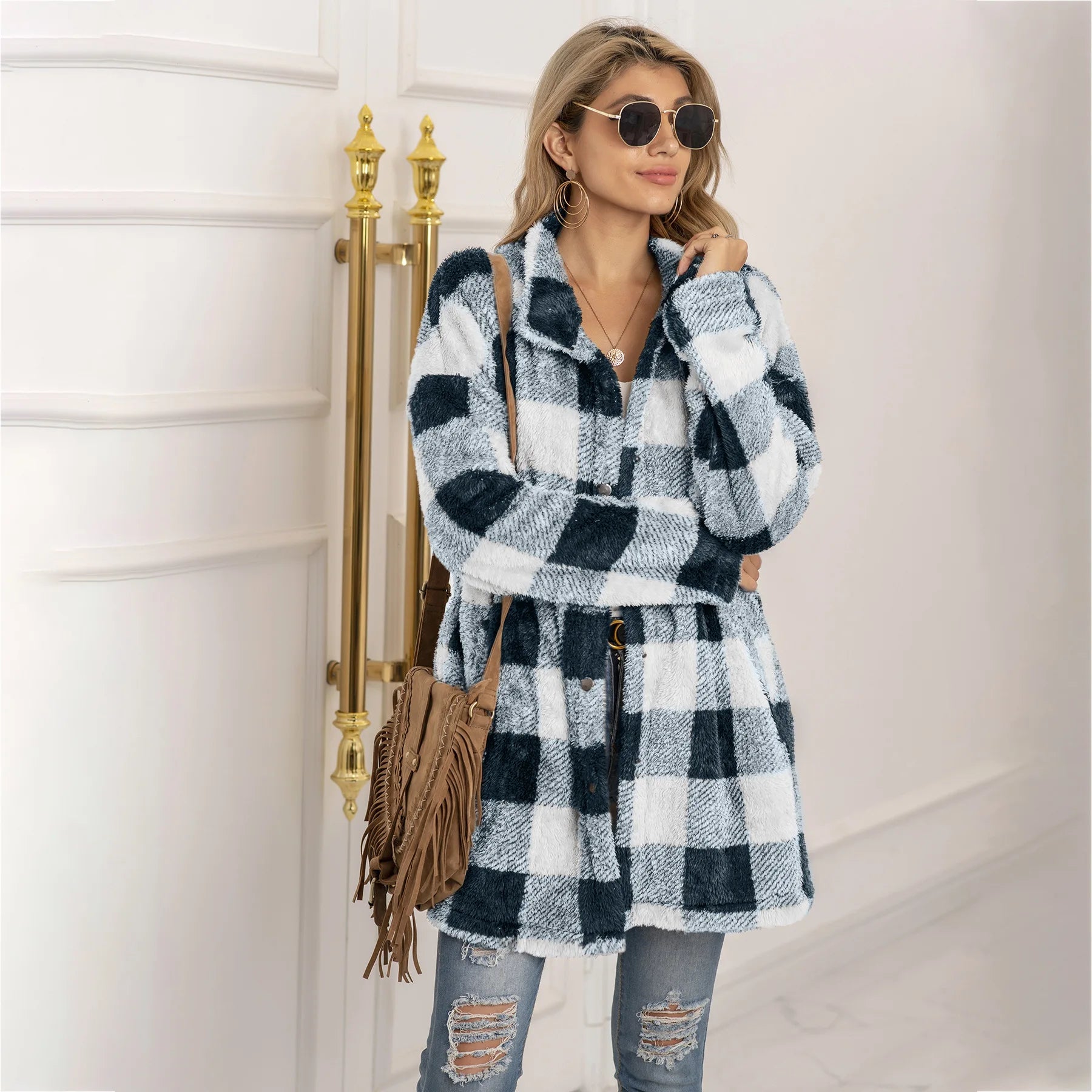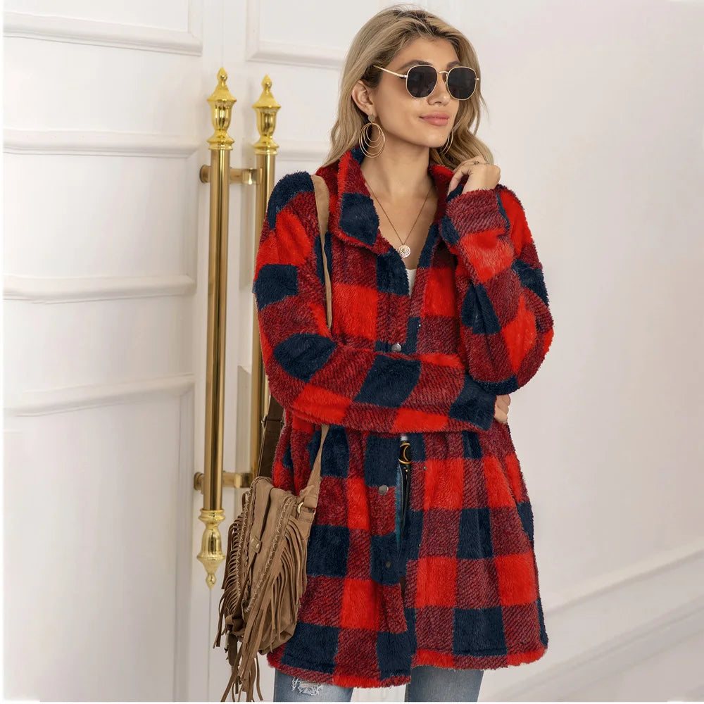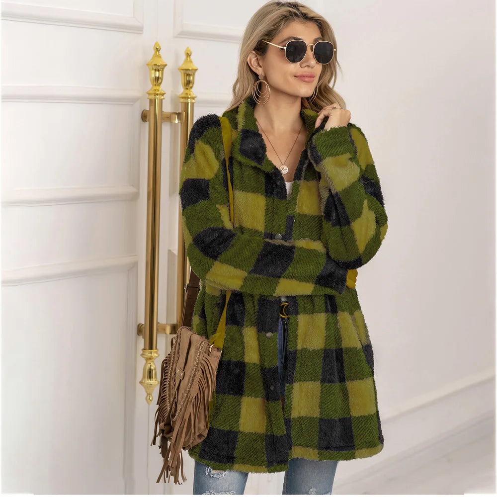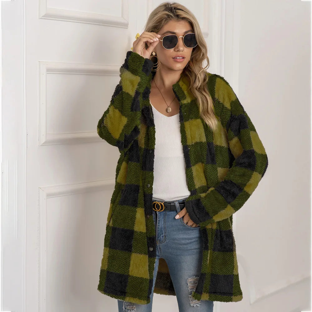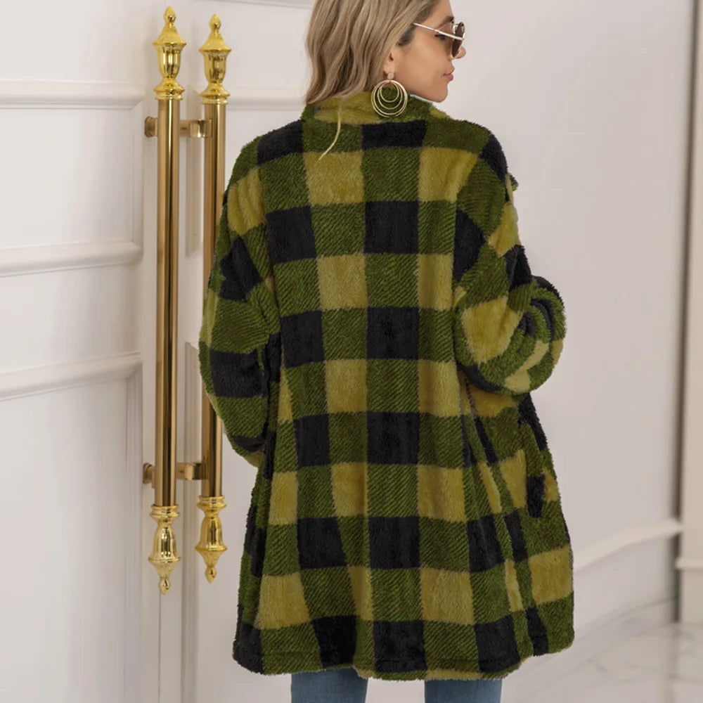 Elegante Geruite Pluche Lange Jas: Tijdloze Stijl, Luxueus Comfort