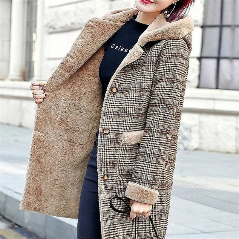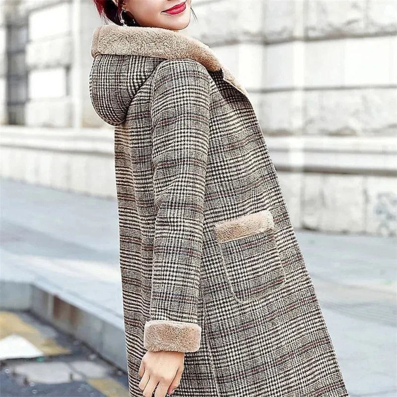 Elegante Geruite Wollen Winterjas - Capuchon, Gevoerd met Fluweel, Mid-Lengte met Nepbont Rand