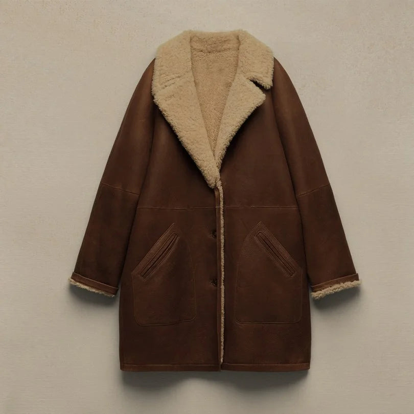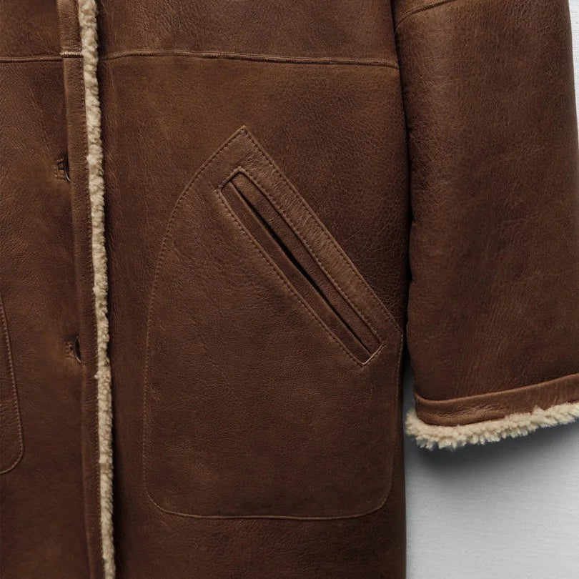 Ervaar de zachte omhelzing van premium schapenleer. Het lange, vloeiende ontwerp straalt verfijning uit, waardoor het een ideale keuze is voor elke gelegenheid, van casual uitjes tot elegante avonden.