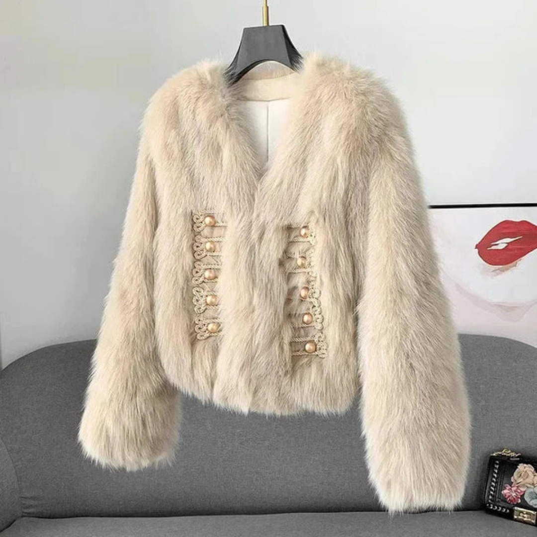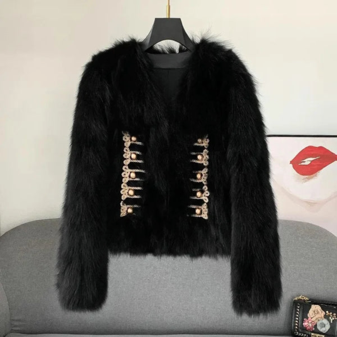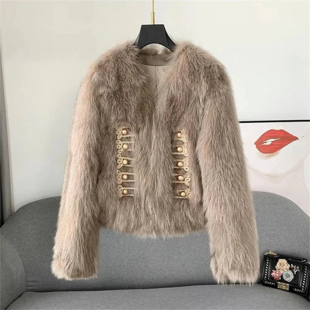 Elegantie Fluistering: Marquise-Inspireerde Luxe Faux Fur Jas met Juweel Sluitingen