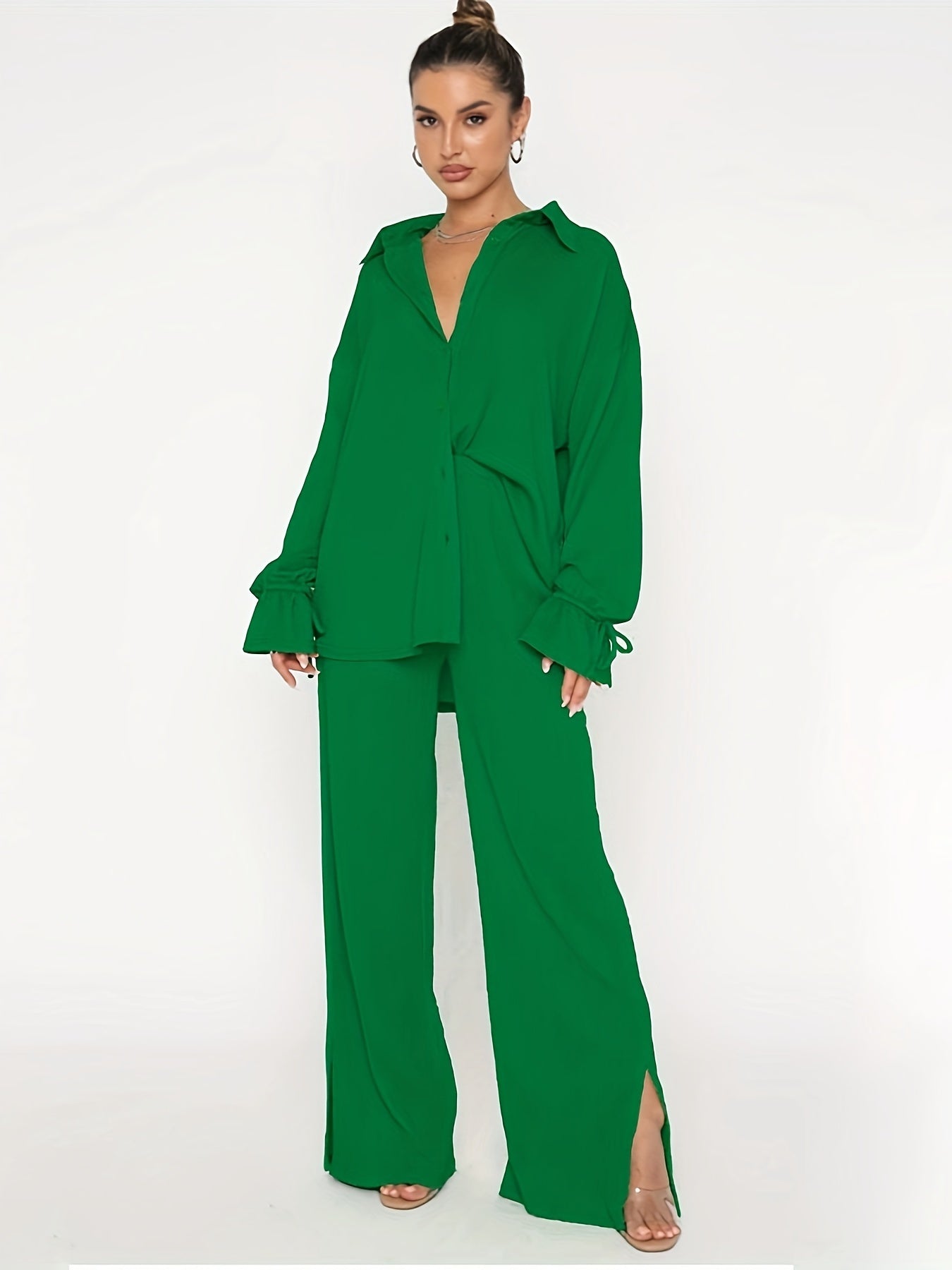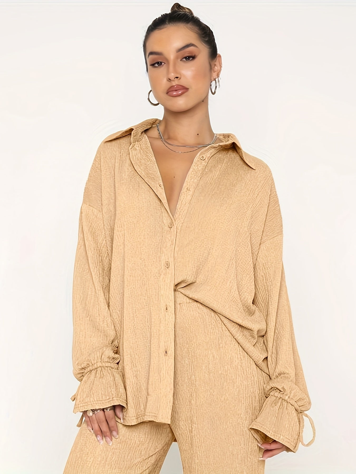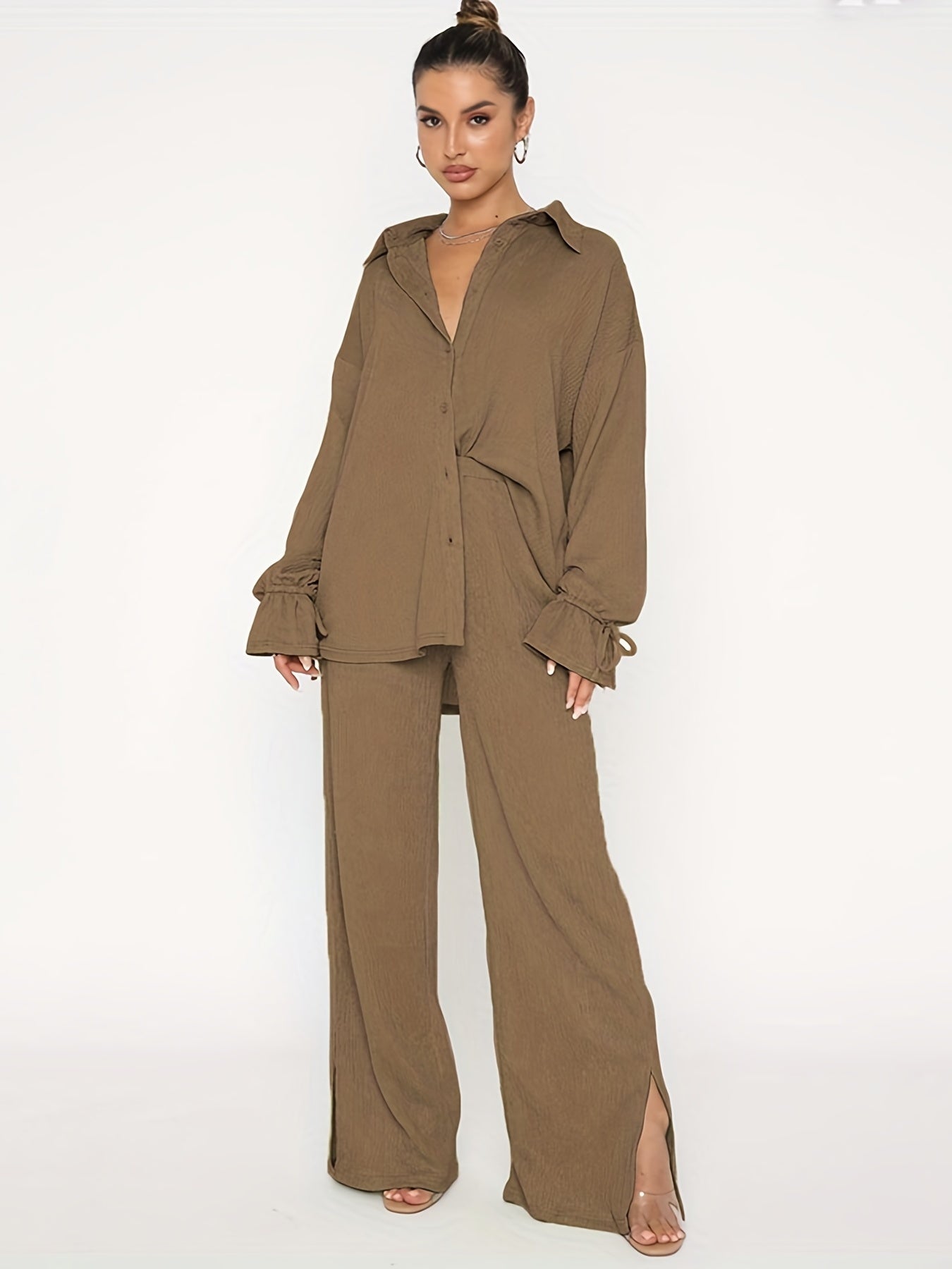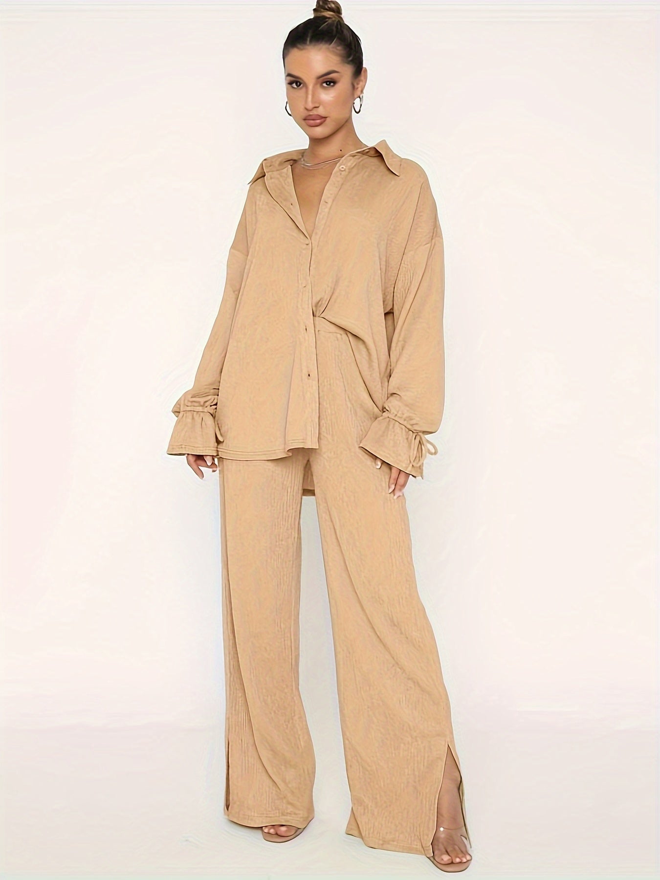 Chic en Comfortabel Ons tweedelige set biedt een perfecte mix van stijl en comfort. De casual button-down top met trekkoord geeft een relaxte look, terwijl de split wide leg broek een moderne twist toevoegt.