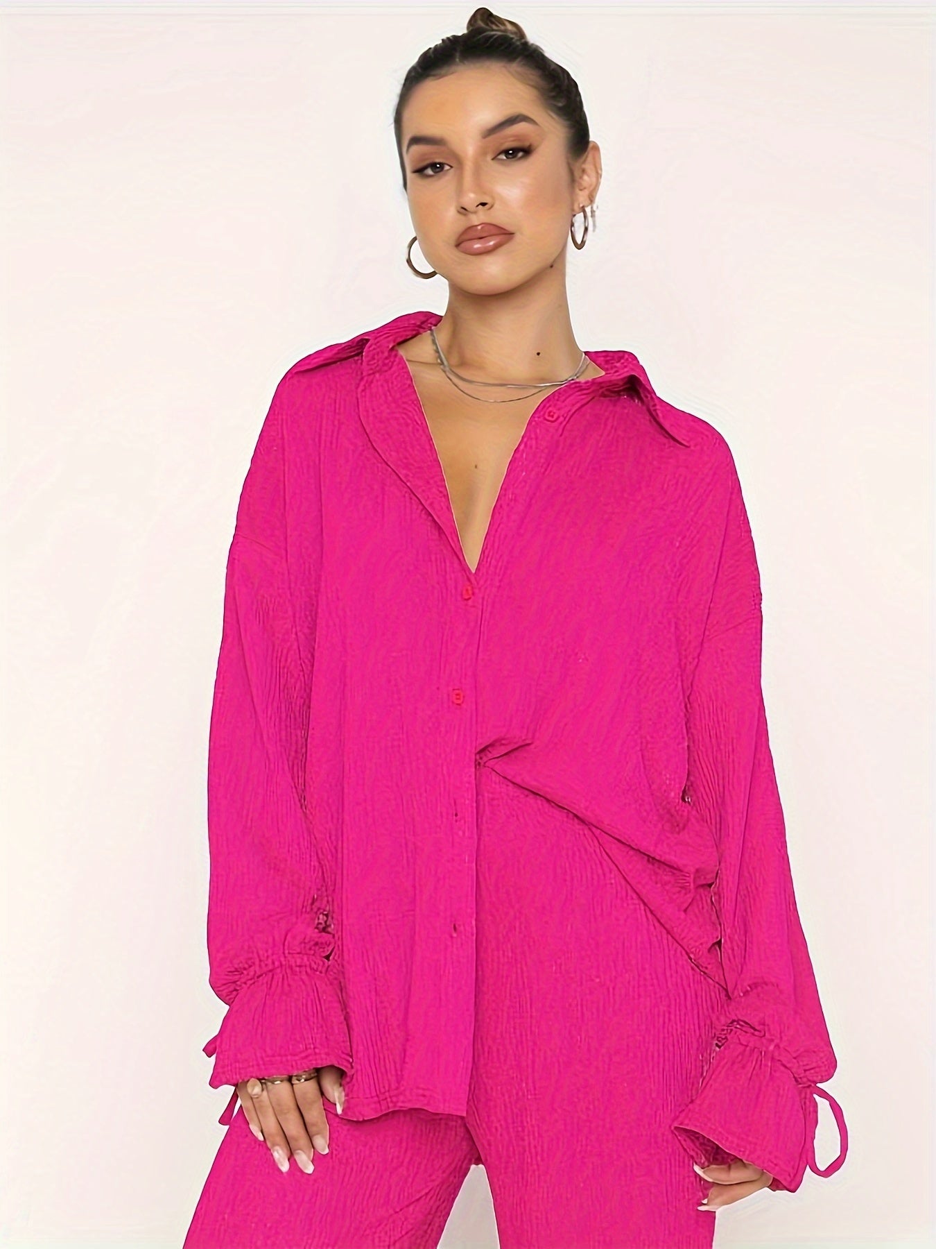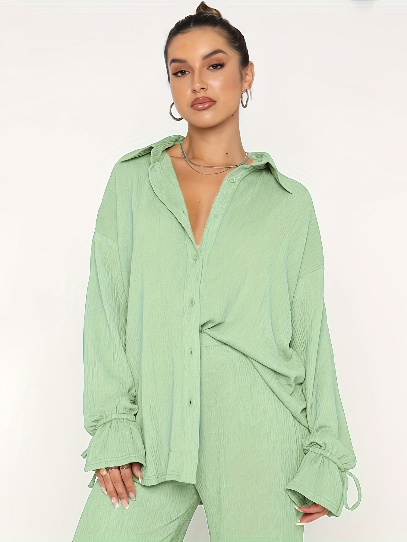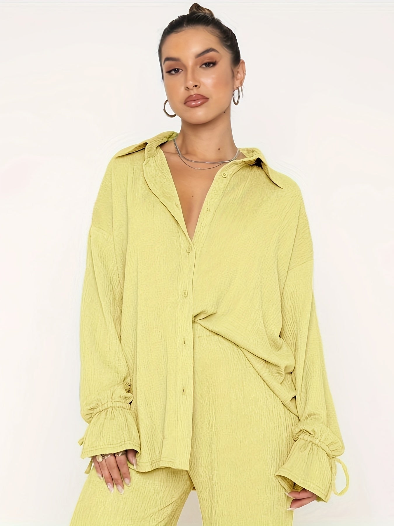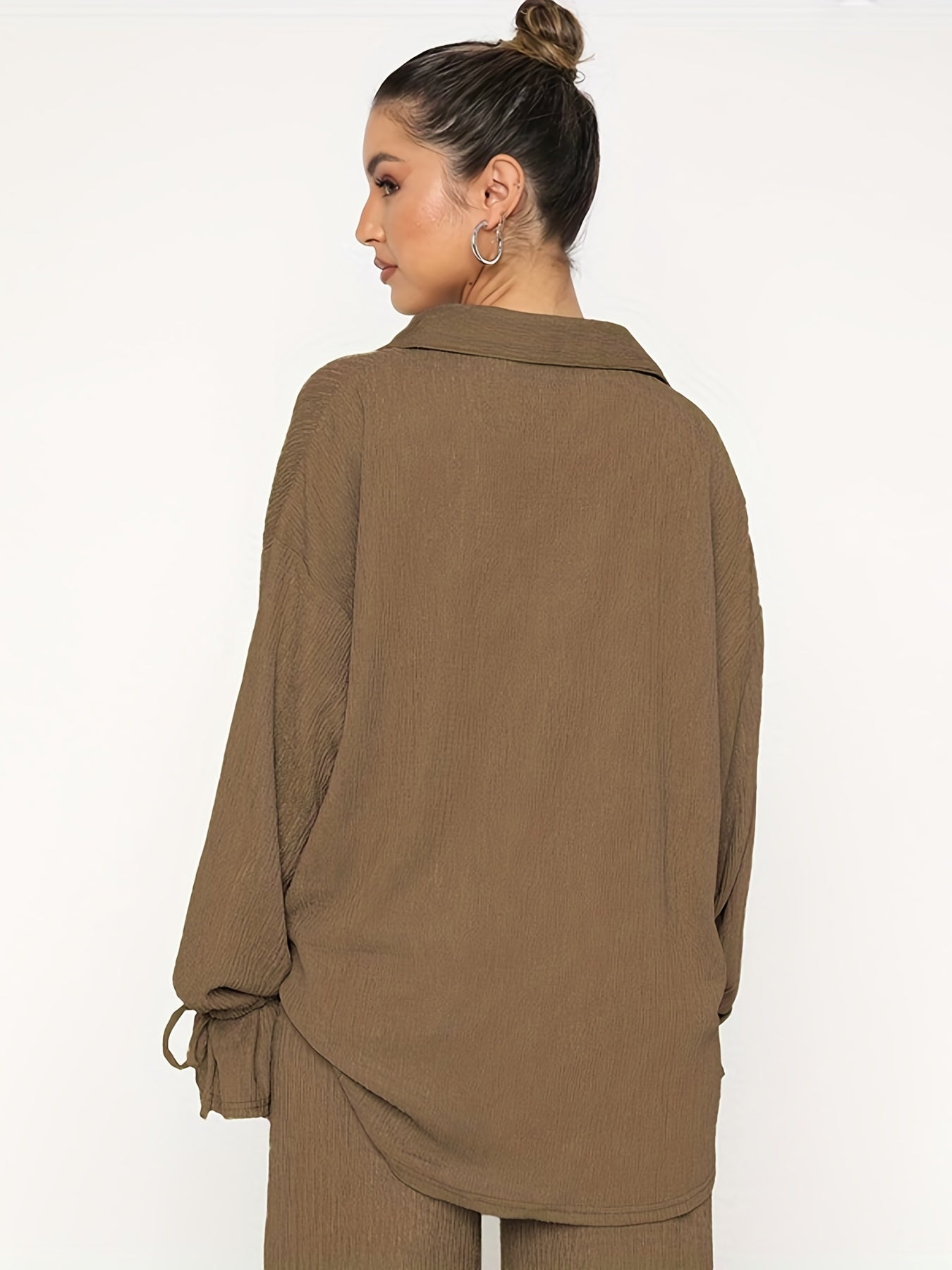Chic en Comfortabel Ons tweedelige set biedt een perfecte mix van stijl en comfort. De casual button-down top met trekkoord geeft een relaxte look, terwijl de split wide leg broek een moderne twist toevoegt.