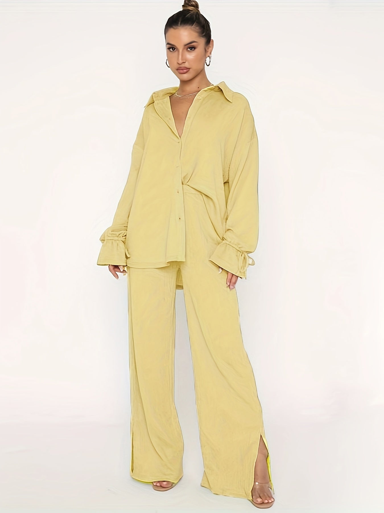 Voel je zelfverzekerd en stijlvol met ons Geel Tweedelig Set met Split, ontworpen om je look te verbeteren en je comfort te maximaliseren
