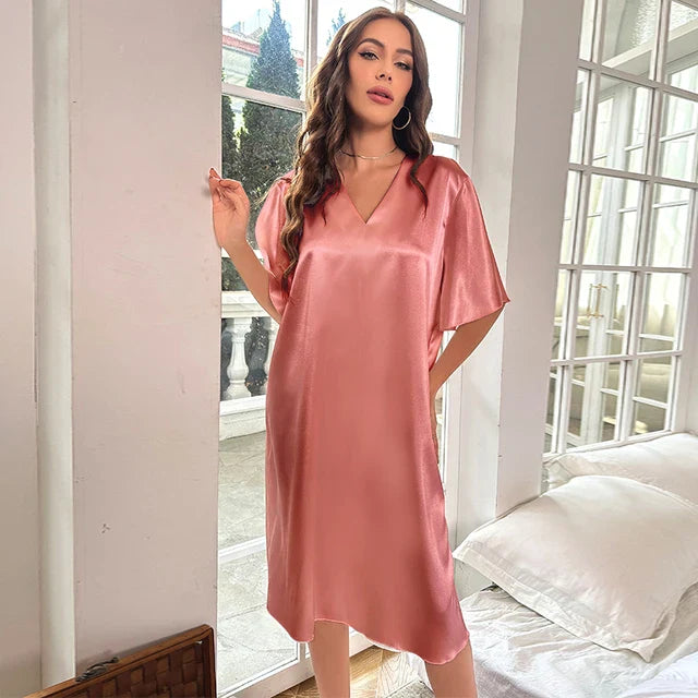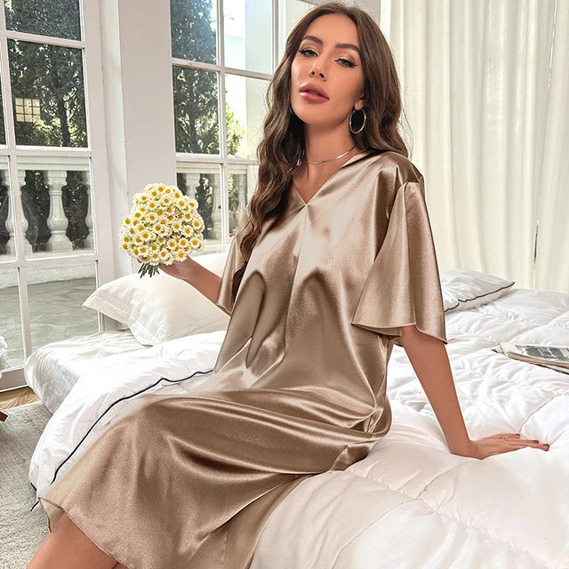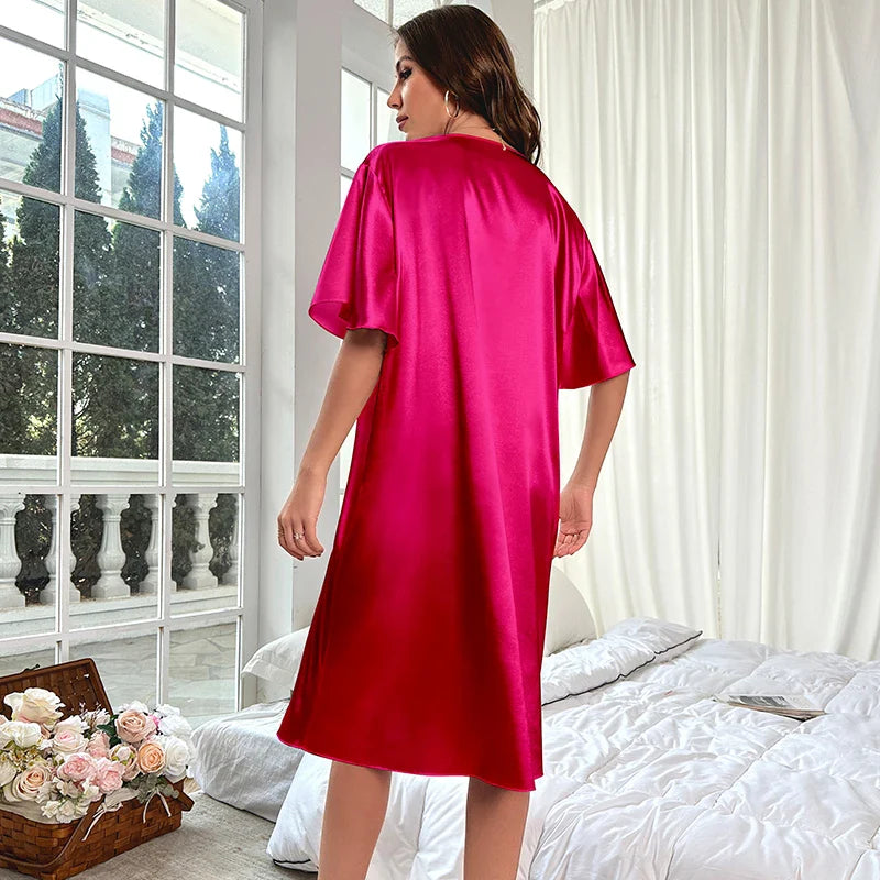Luxe Comfort: Vervaardigd uit ijssatijn, biedt dit nachthemd een 'cool feeling' die ideaal is voor warmere nachten. De lange, vloeiende snit en korte mouwen zorgen voor een vrij gevoel terwijl je beweegt, perfect voor een ontspannen nacht.