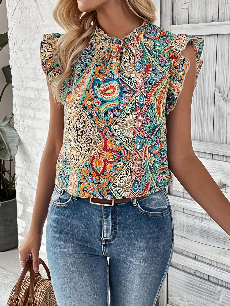Vintage Elegantie Ontmoet Moderne Trends: Deze prachtige top, gekenmerkt door zijn levendige etnische print en schitterende groene kleur, is een ode aan de retrostijl. De vlinder mouwen voegen een speels en vrouwelijk element toe dat je natuurlijke gratie accentueert.