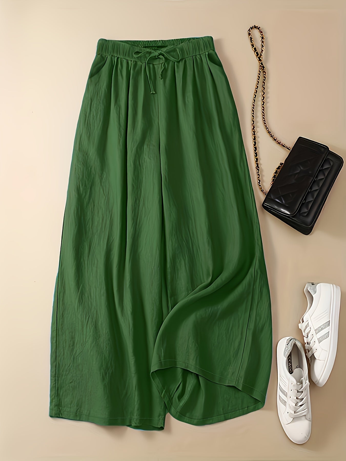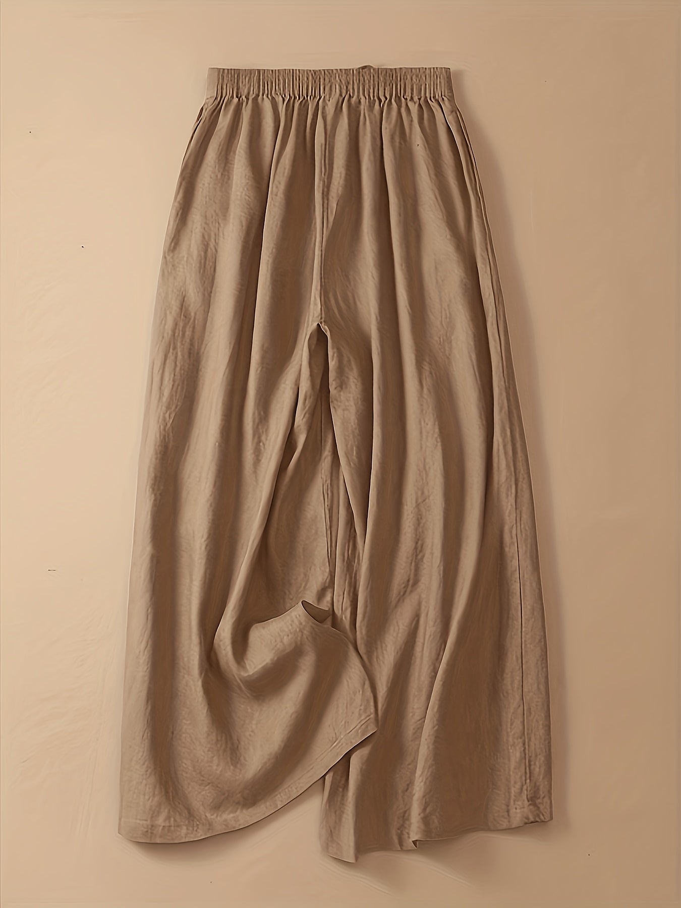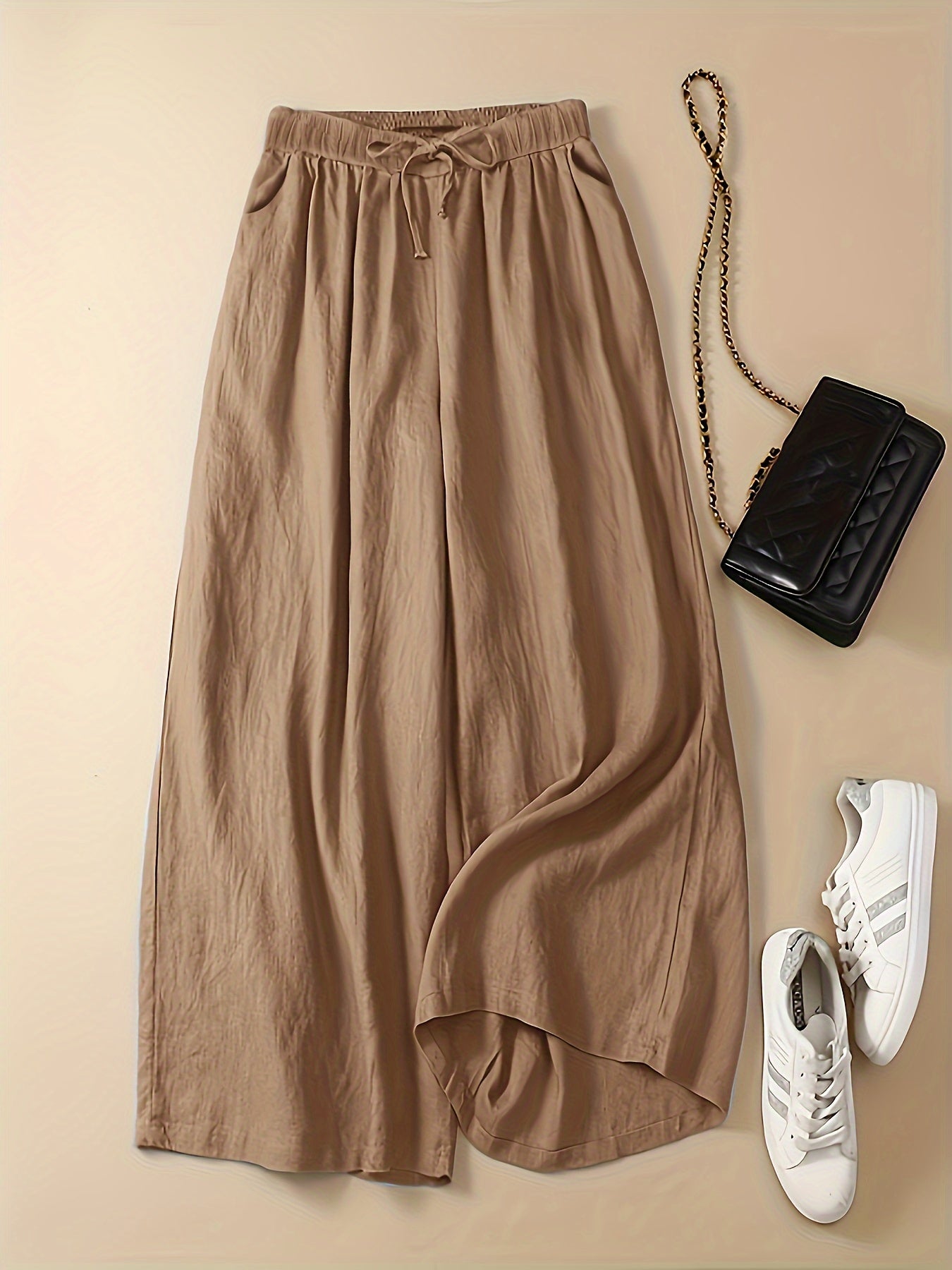 Casual en Chic: Deze broek heeft wijde pijpen en een elastische tailleband met trekkoord voor een comfortabele pasvorm. De khaki kleur zorgt voor een tijdloze en veelzijdige uitstraling die bij elke outfit past.