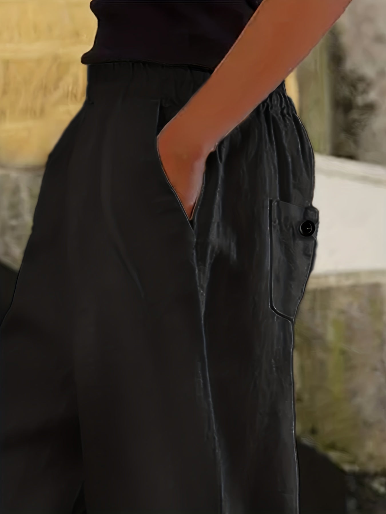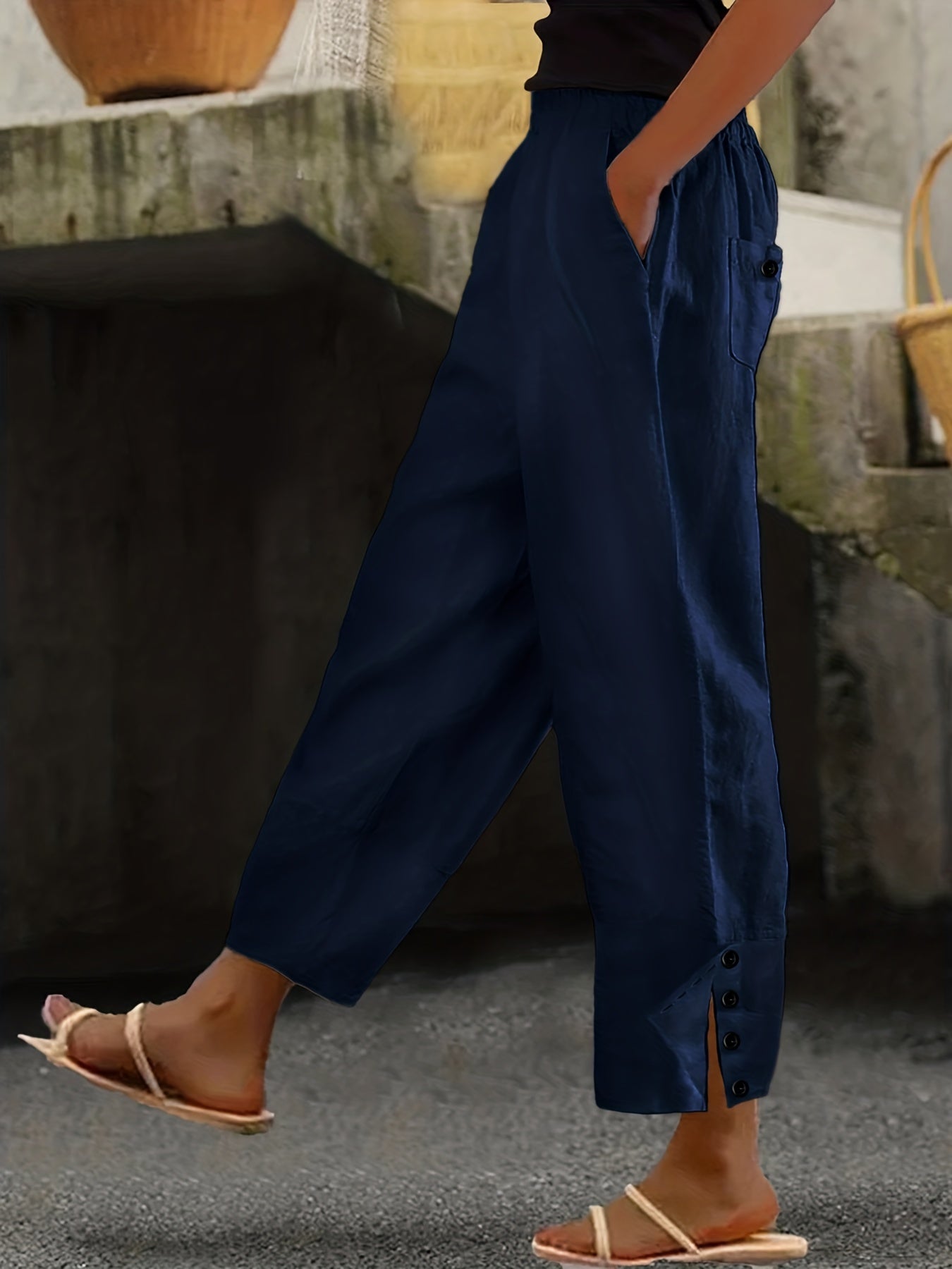 Stijl Ontmoet Praktische Details: Gemaakt van ademende en duurzame stof, biedt deze broek zowel comfort als stijl. De knoopdetails aan de zijkant voegen een modieuze touch toe, waardoor deze broek een veelzijdige toevoeging is aan je garderobe.
