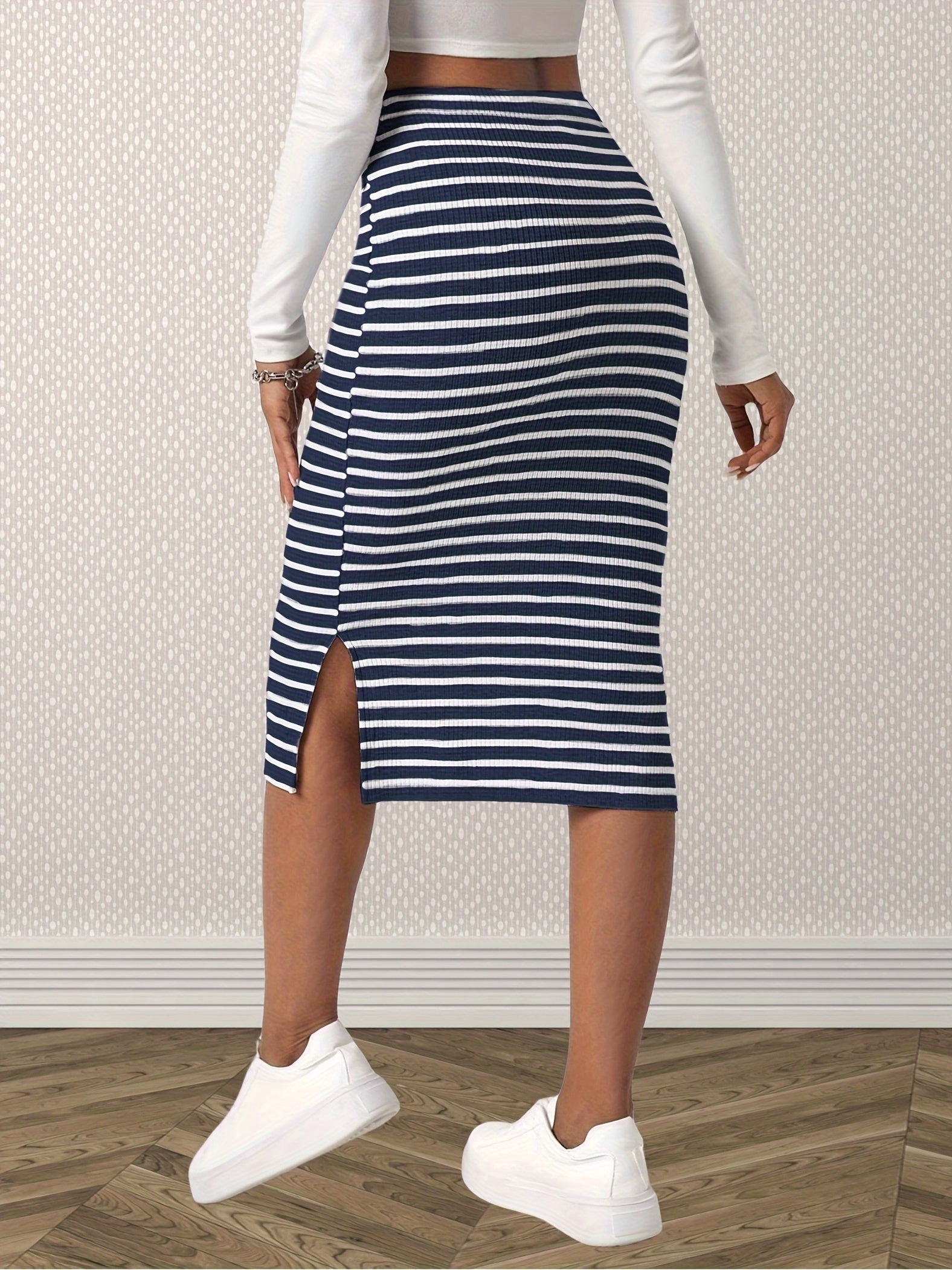 De Lichtgrijze Gestreepte Bodycon Rok - Sophie is de ideale keuze voor vrouwen die een stijlvolle en comfortabele rok willen voor lente- en zomerdagen. Of je nu naar een casual brunch gaat of een zomers avondje uit, met deze rok zie je er altijd chic en zelfverzekerd uit