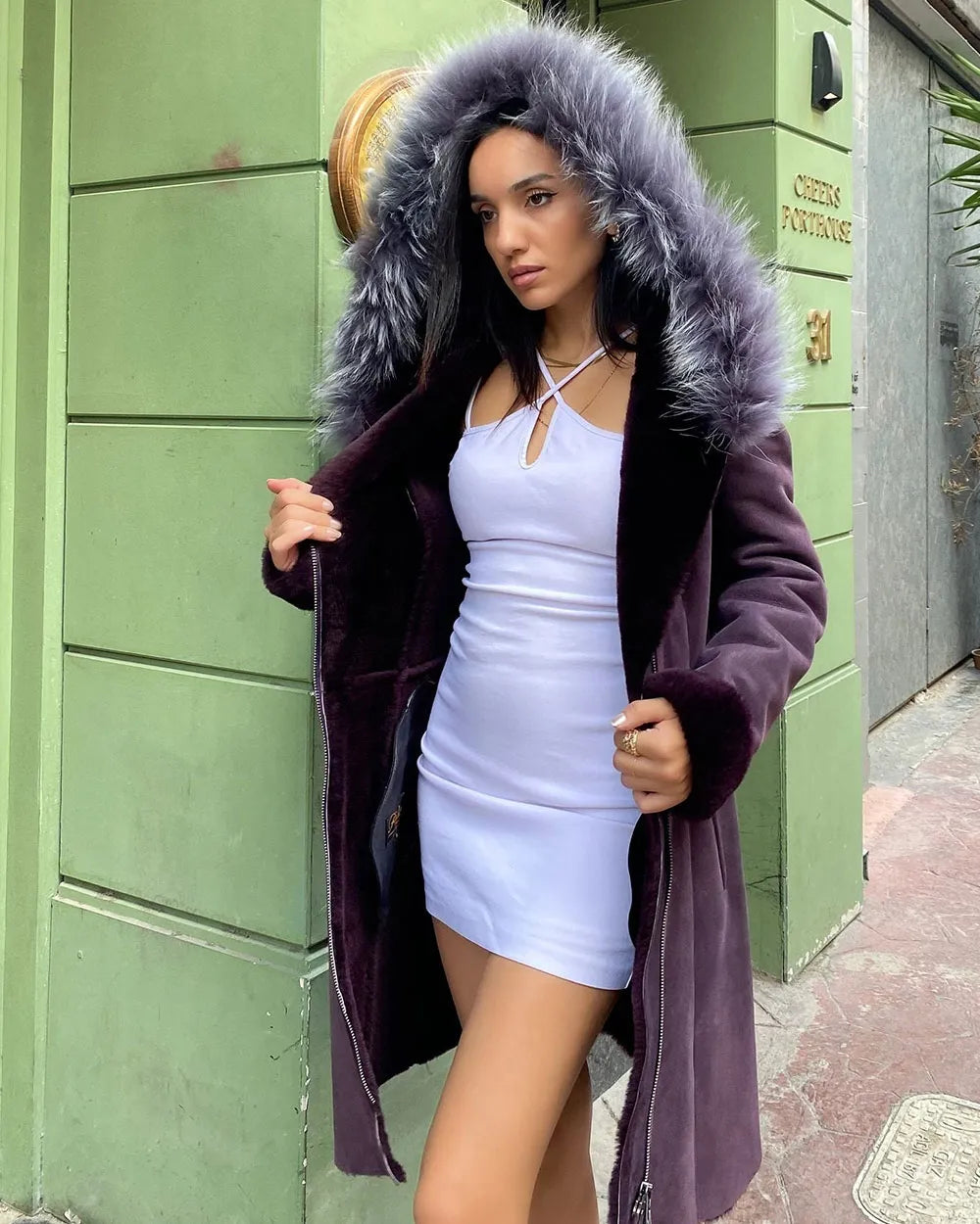Luxe Lamsleren Jas met Elegante Wasbeer Bontkap