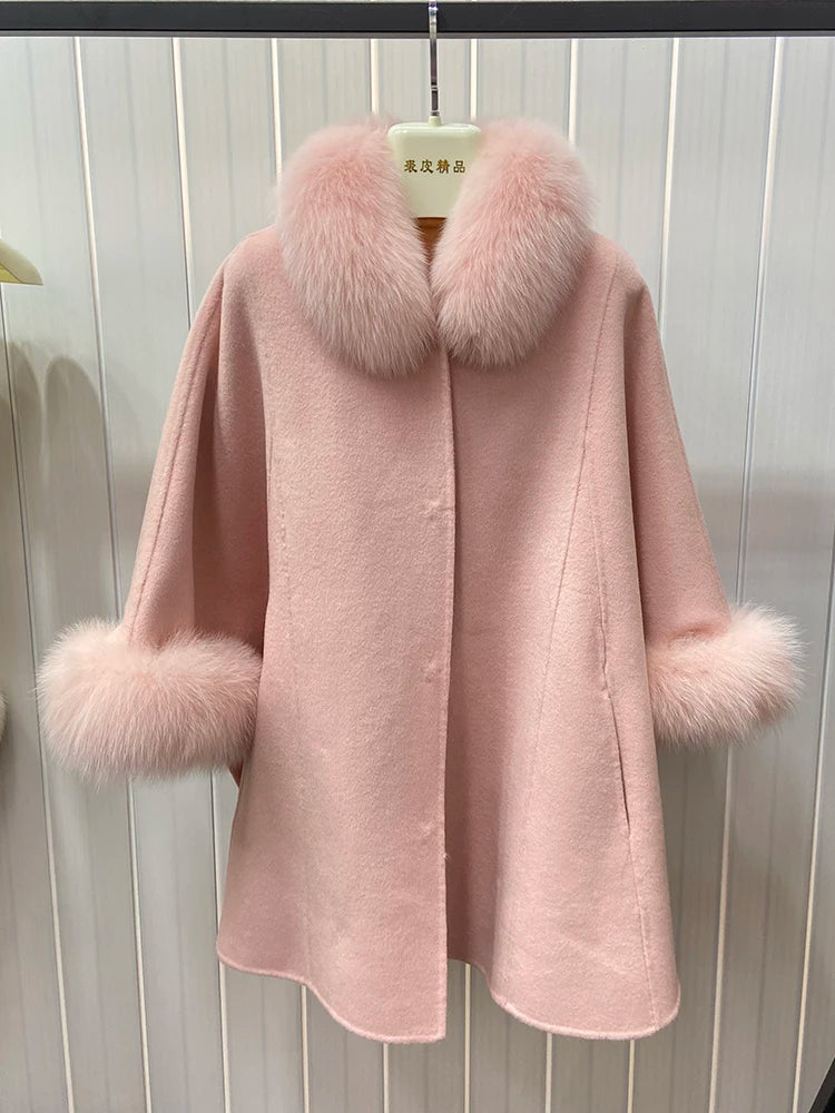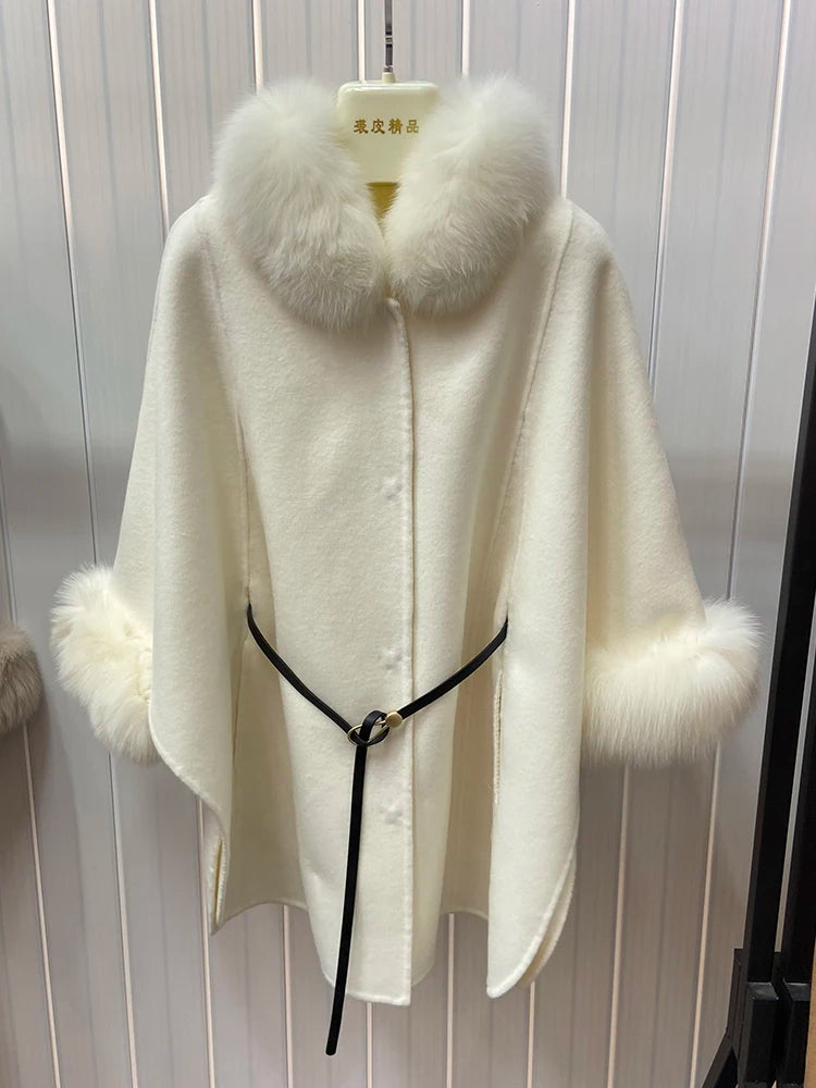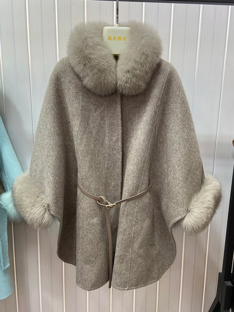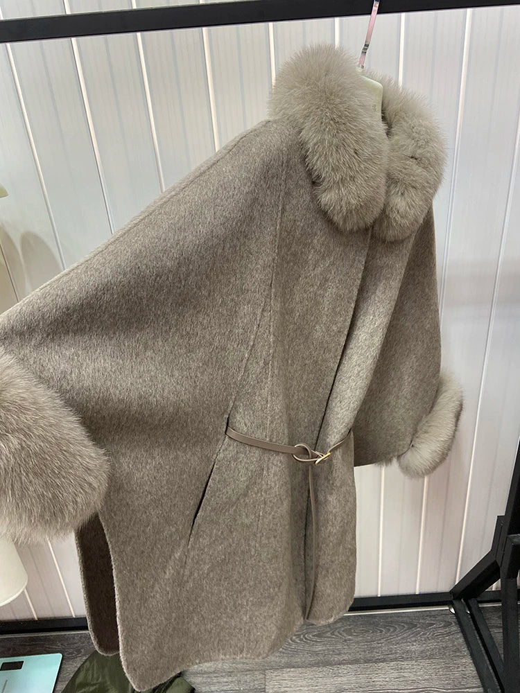 Luxueuze Vossenbont Afwerking: Vervaardigd met echt vossenbont, biedt deze cape ongeëvenaarde zachtheid en een vleugje glamour aan uw outfit.