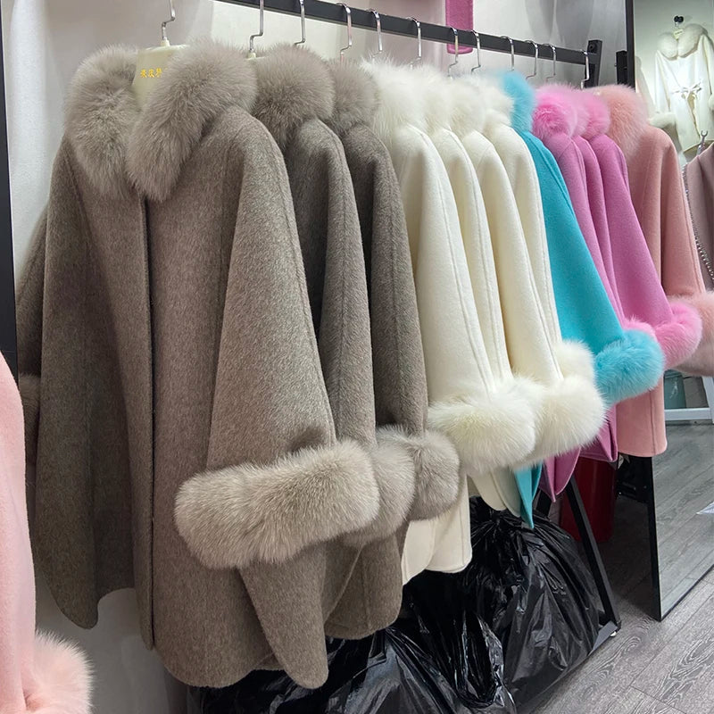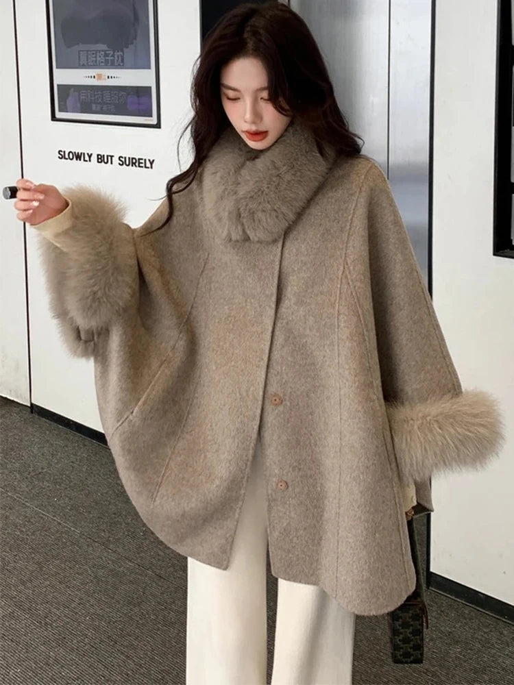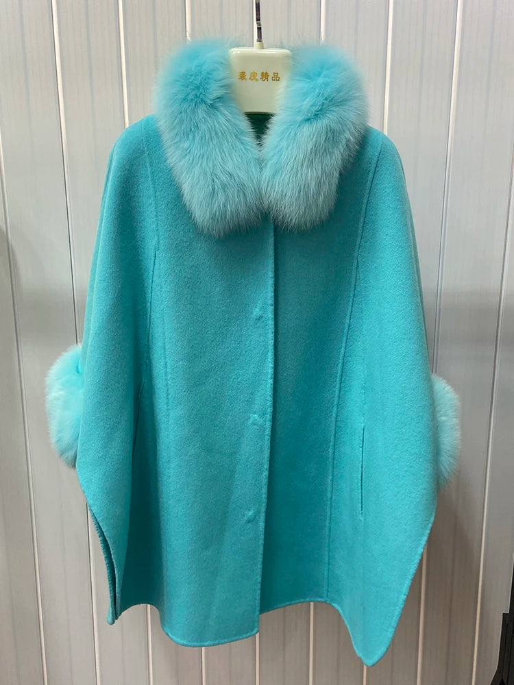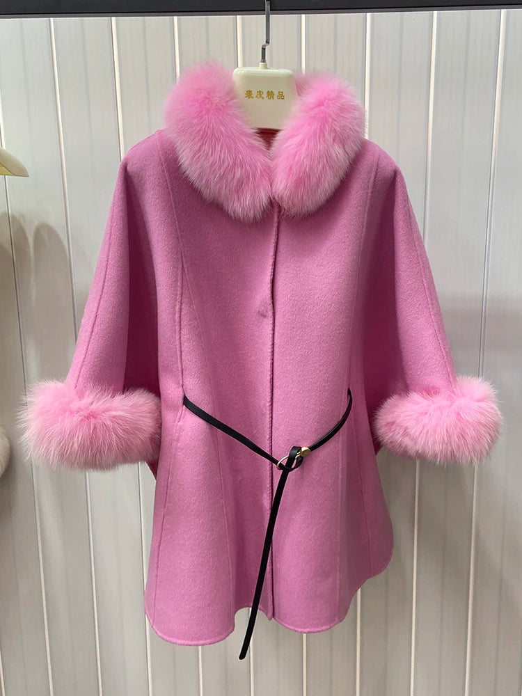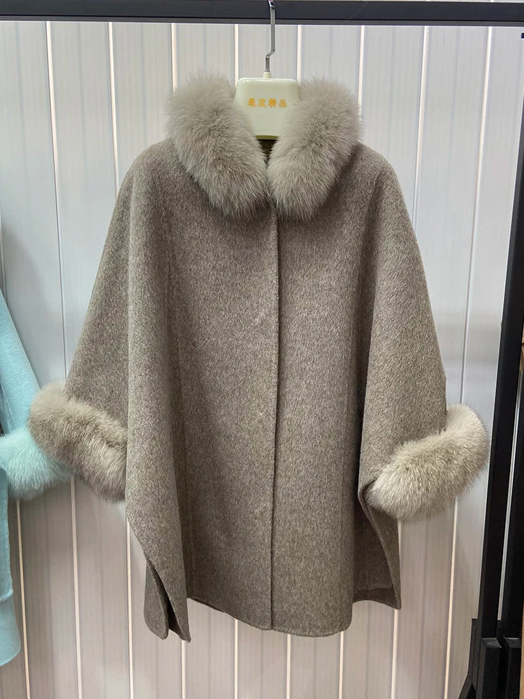 Luxueuze Vossenbont Afwerking: Vervaardigd met echt vossenbont, biedt deze cape ongeëvenaarde zachtheid en een vleugje glamour aan uw outfit.
