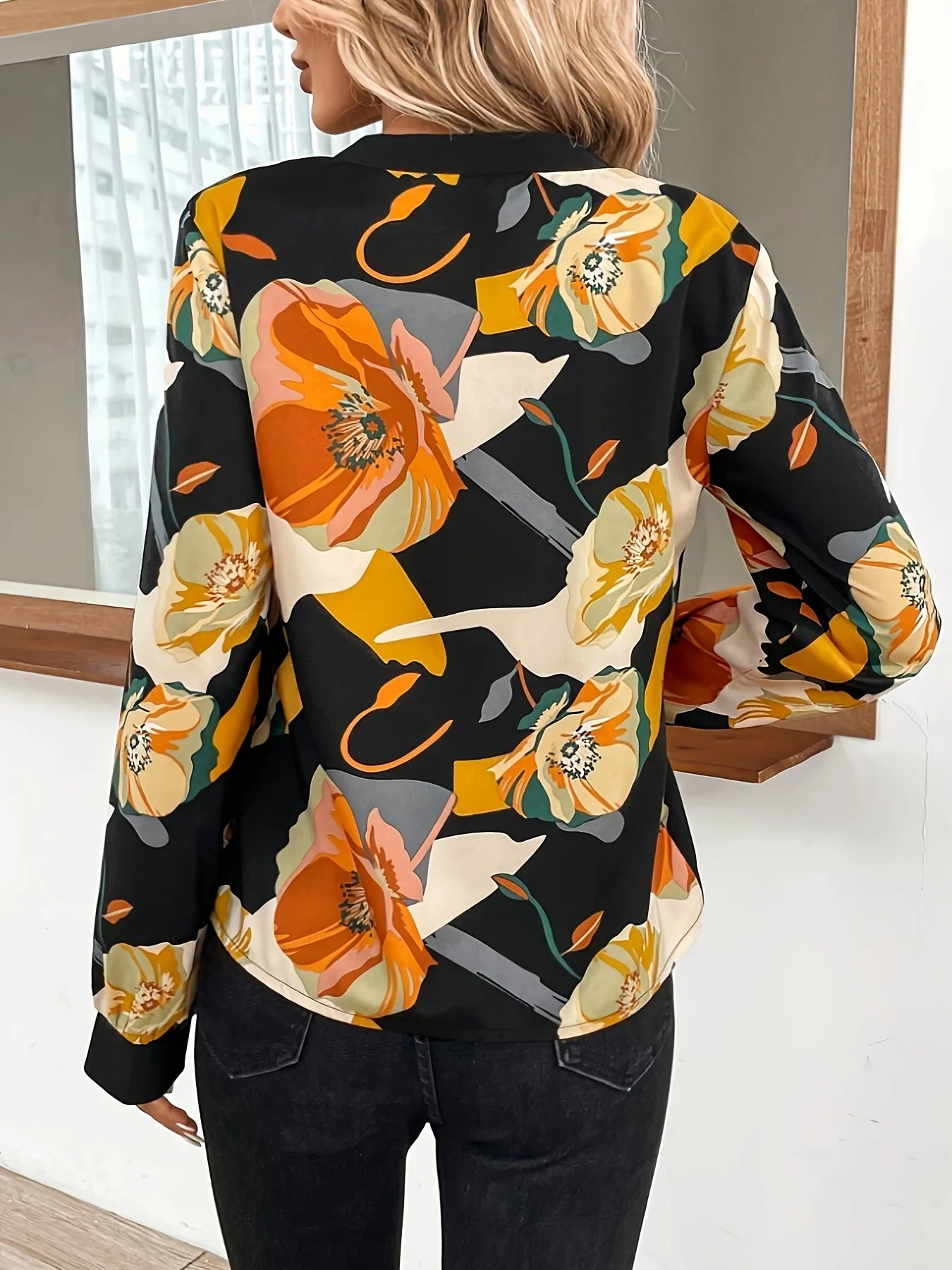 Stijlvol en Flatterend: Deze top met lange mouwen en een diepe V-hals accentueert je figuur op een flatterende manier, terwijl de levendige oranje kleur met bloemenprint zorgt voor een opvallende en frisse look. Perfect voor zowel een dag op kantoor als een avond uit.