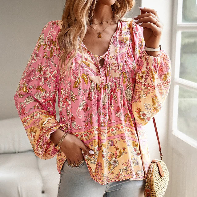Uitgesproken Romantisch: Gedrenkt in een prachtig bloemenpatroon, is deze blouse een viering van vrouwelijkheid en flair. De V-hals en lange mouwen voegen een klassiek element toe, terwijl het losse model zorgt voor een comfortabele en flatterende pasvorm voor alle lichaamstypes.