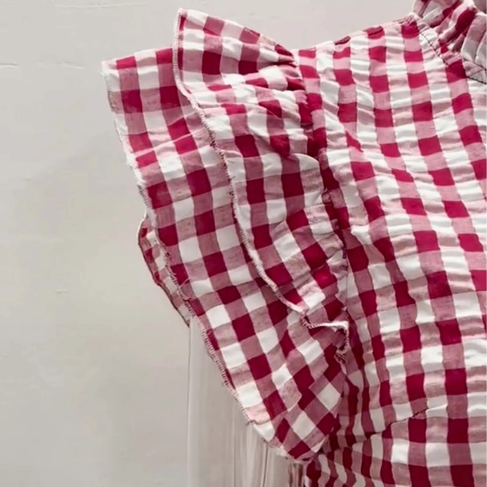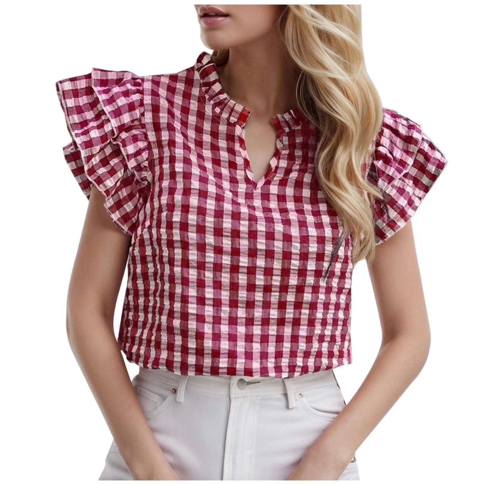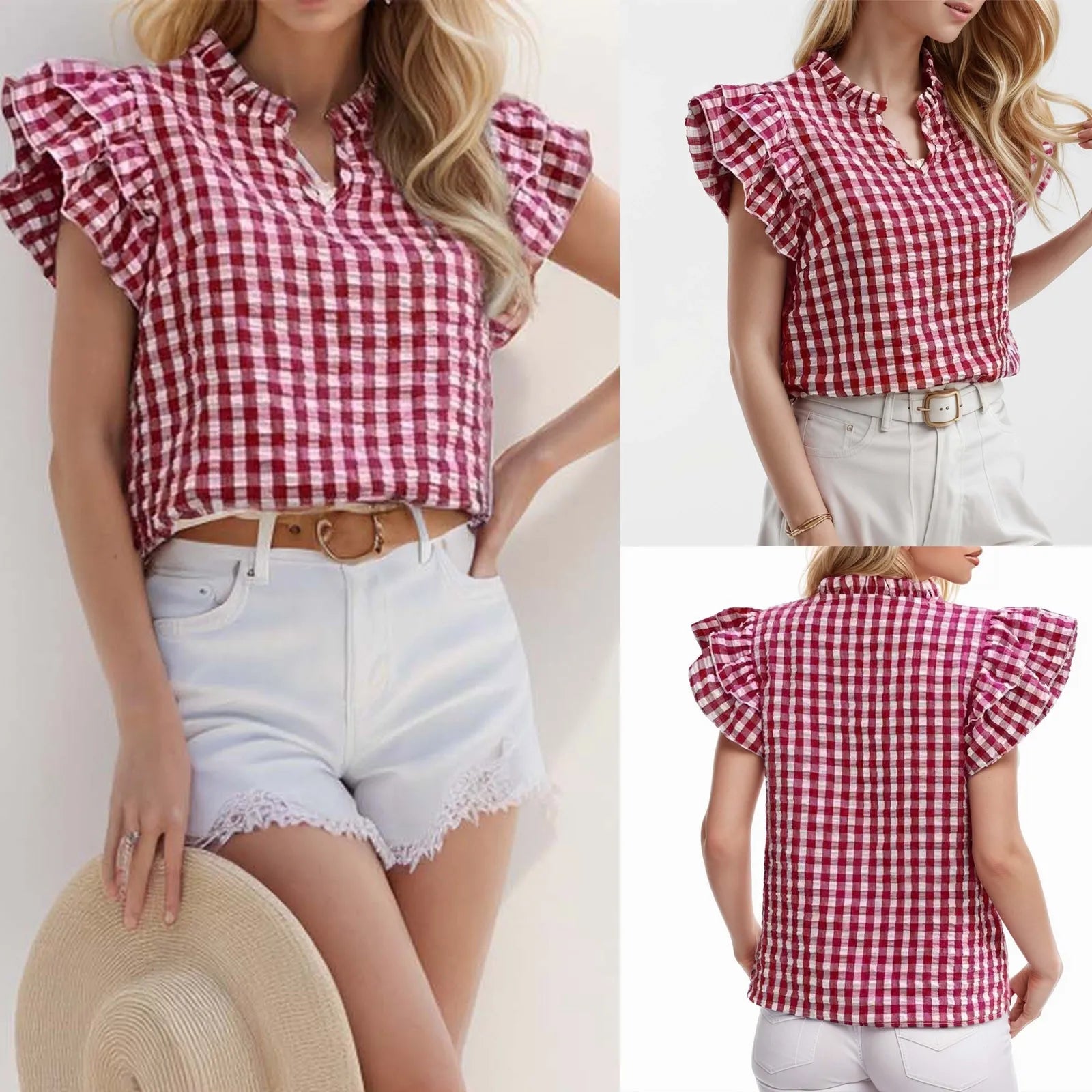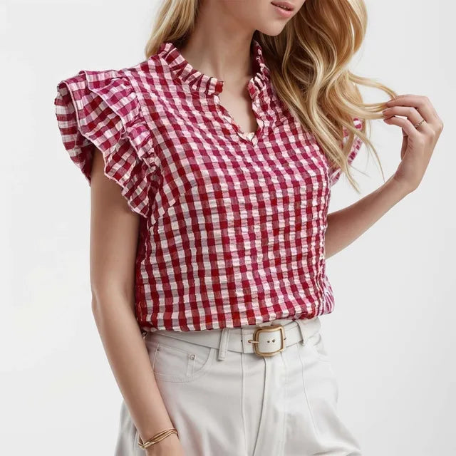 Klassiek Ontmoet Comfort: Gemaakt van zachte, ademende stoffen, biedt dit geruite V-hals topje met ruchesmouwen een uitstekende combinatie van comfort en klassieke stijl. De levendige rode kleur en het subtiele patroon zijn ideaal voor zowel een zakelijke lunch als een casual dagje uit.
