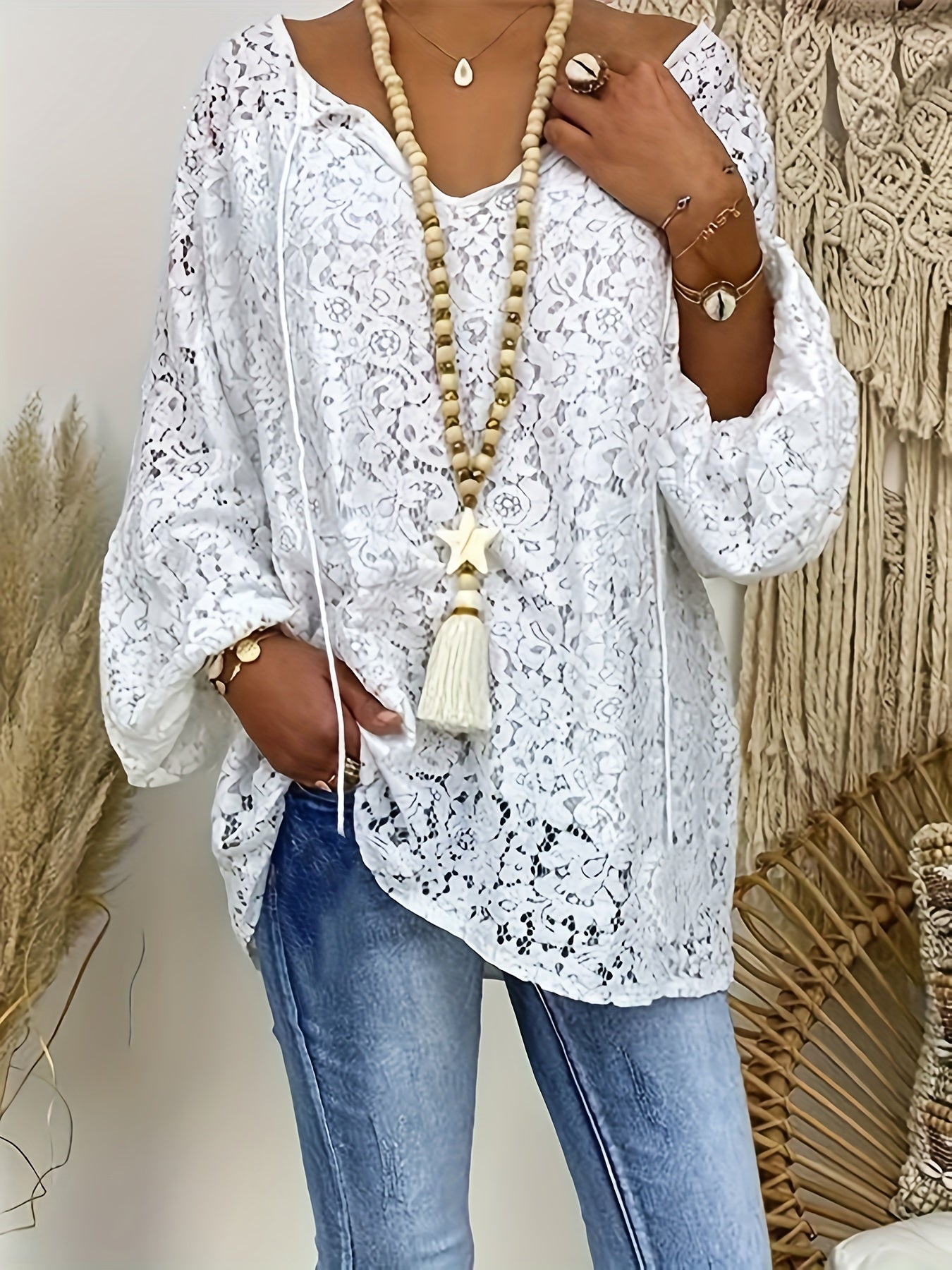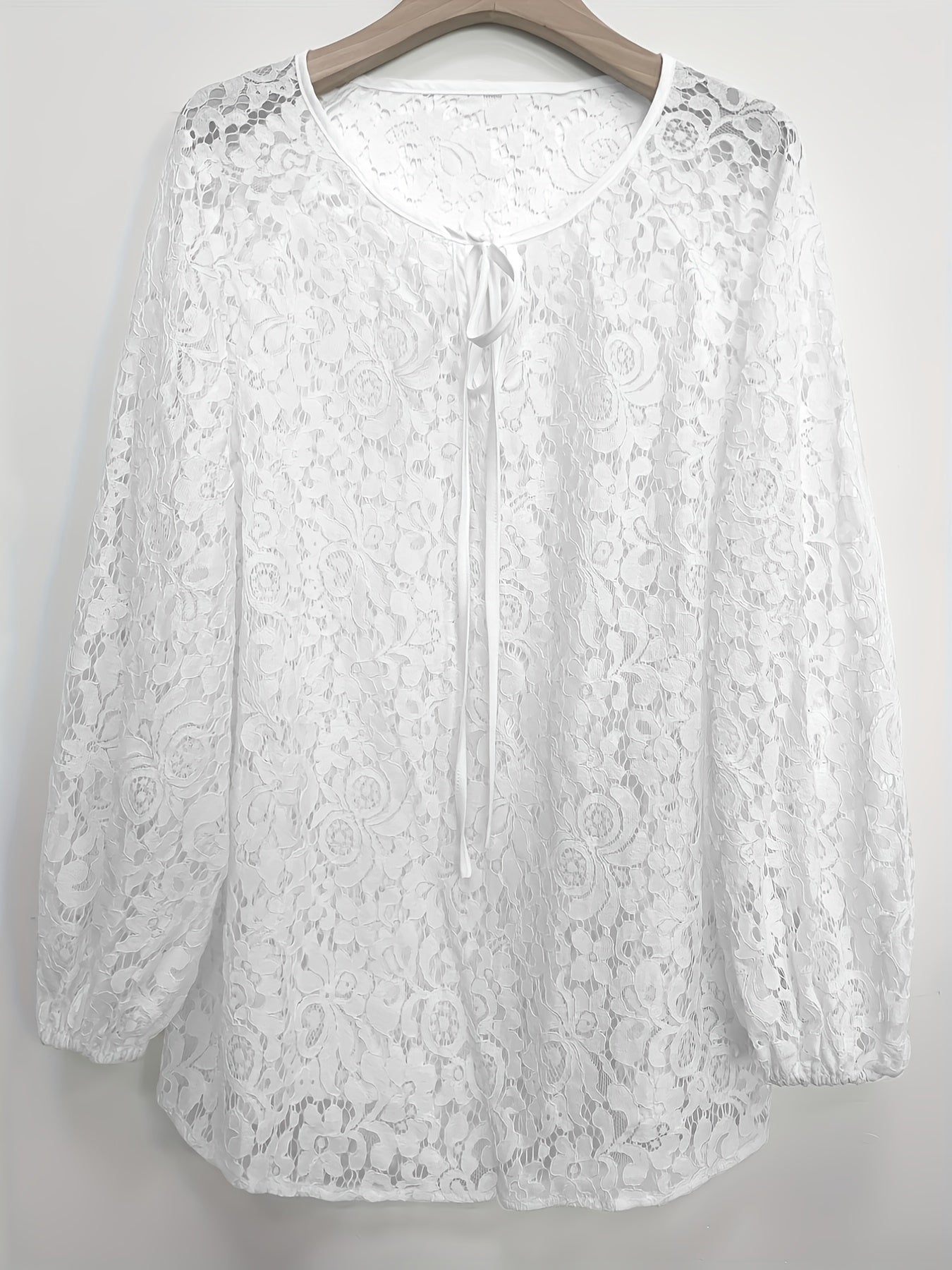Elegant en Comfortabel Onze blouse combineert contrasterend kant met een stijlvolle striksluiting aan de voorkant, waardoor je een vrouwelijke en elegante uitstraling krijgt. De lange mouwen maken het ideaal voor koelere dagen, terwijl het lichte materiaal zorgt voor comfort.