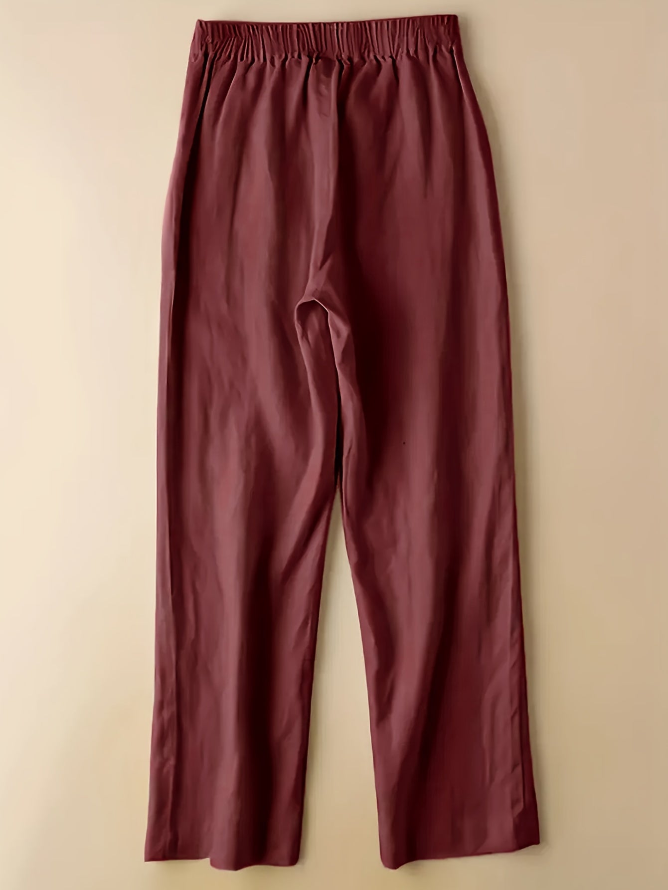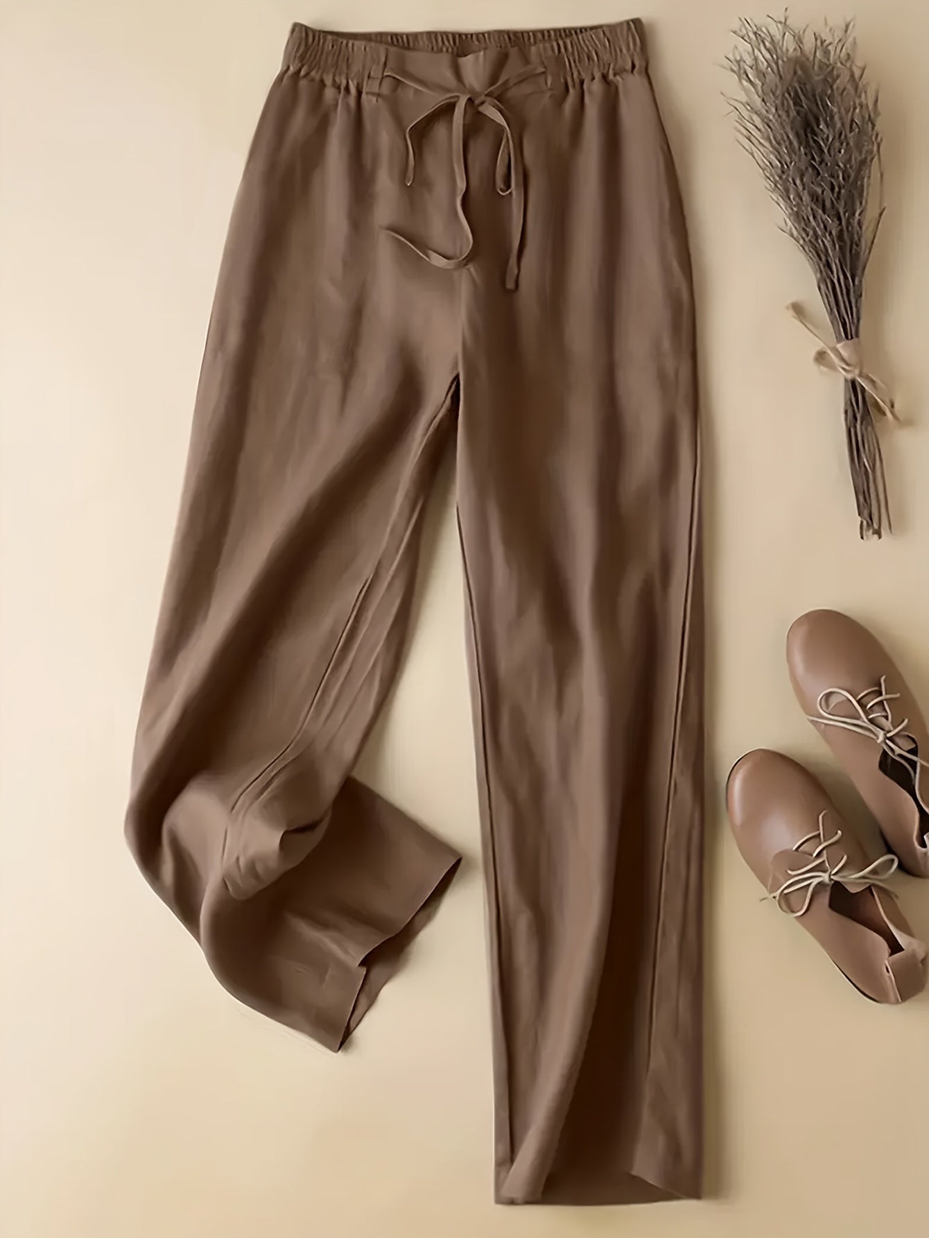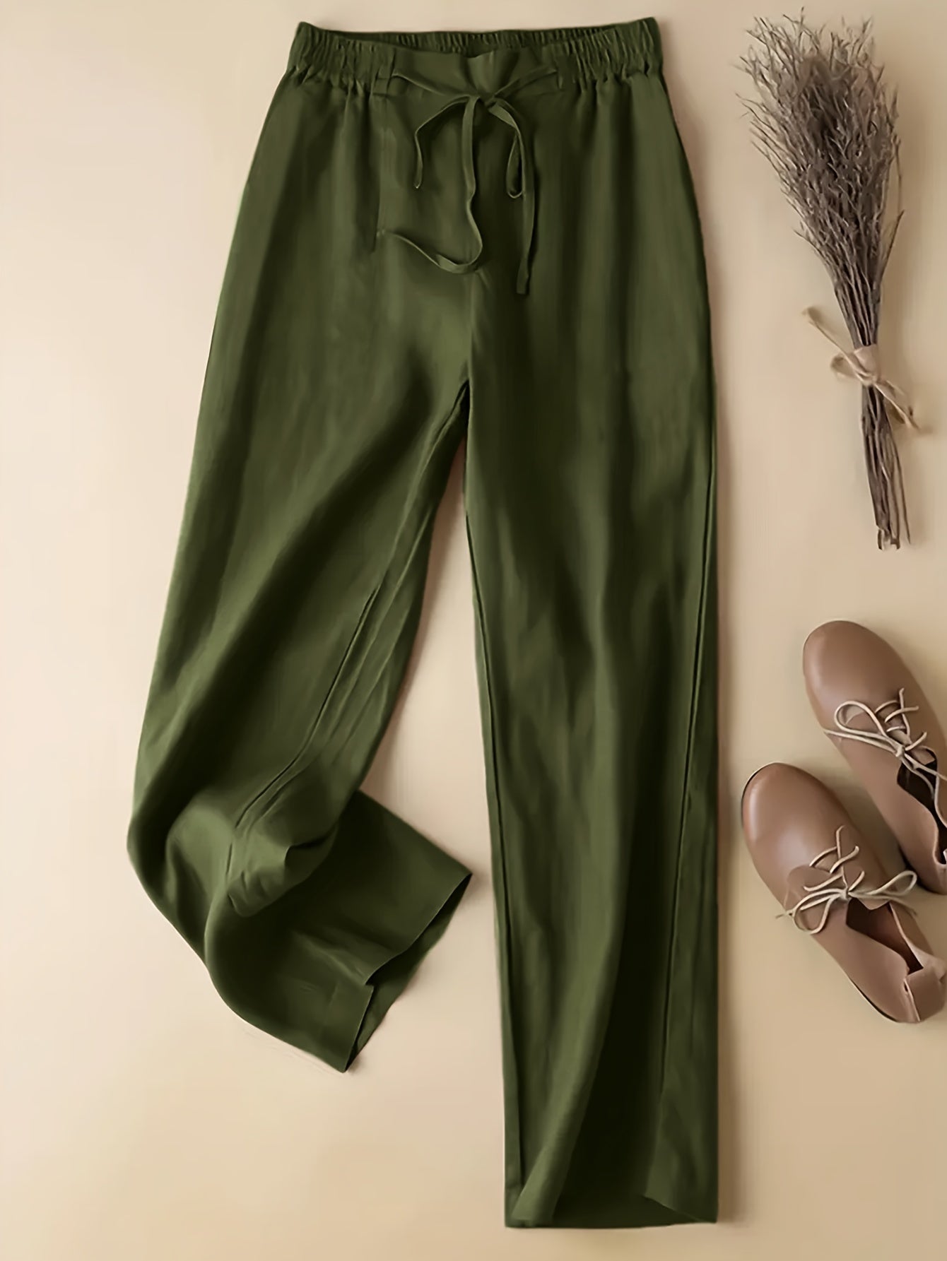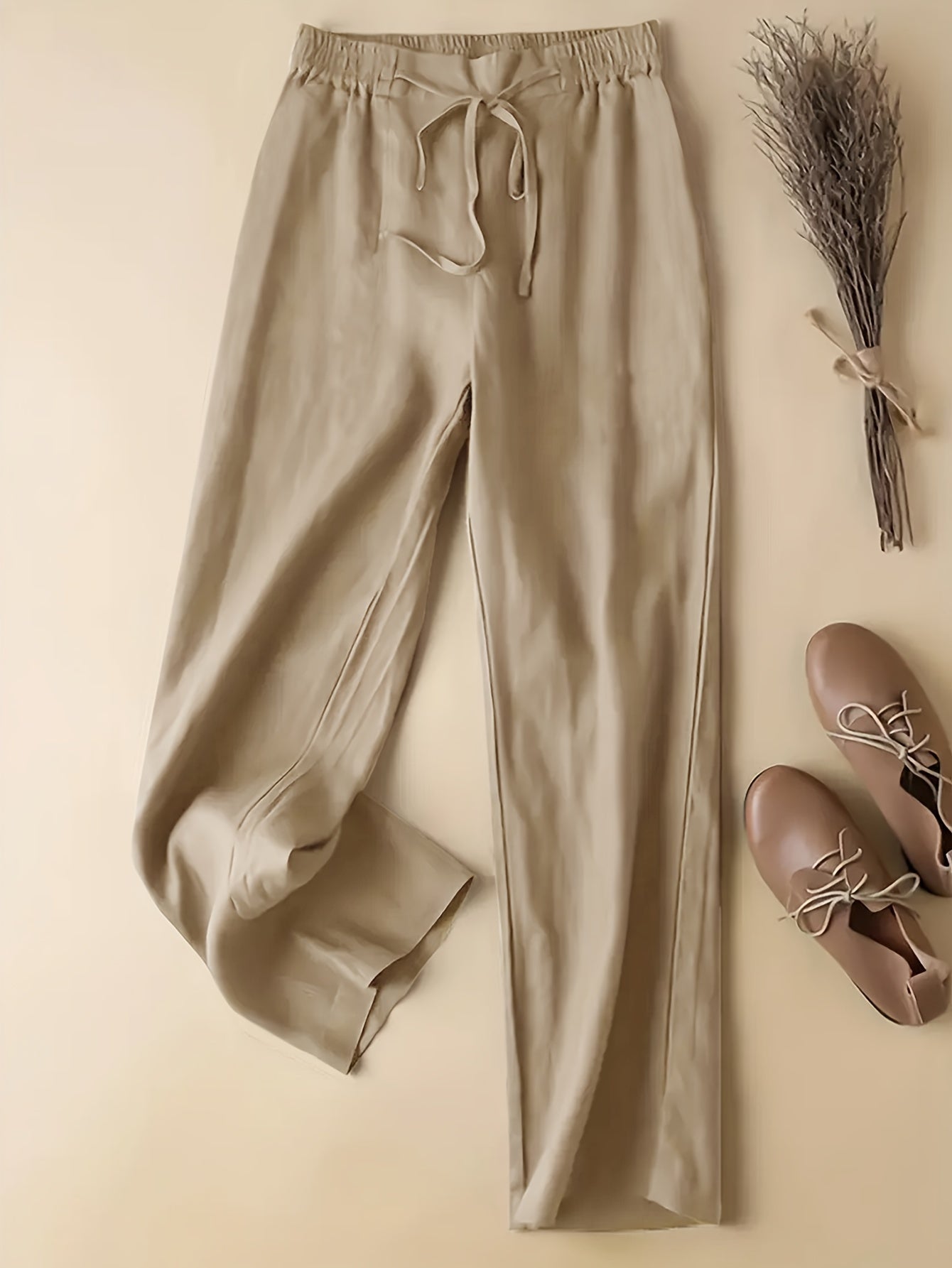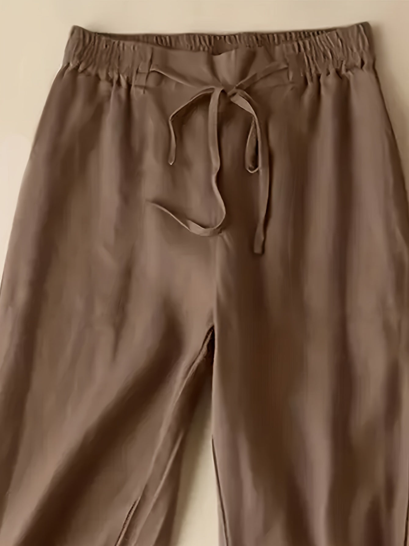 Luchtig en Comfortabel: Gemaakt van hoogwaardig materiaal, biedt deze broek een ademende en comfortabele pasvorm. De hoge taille en het strikdetail zorgen voor een elegante look en ultiem gemak.
