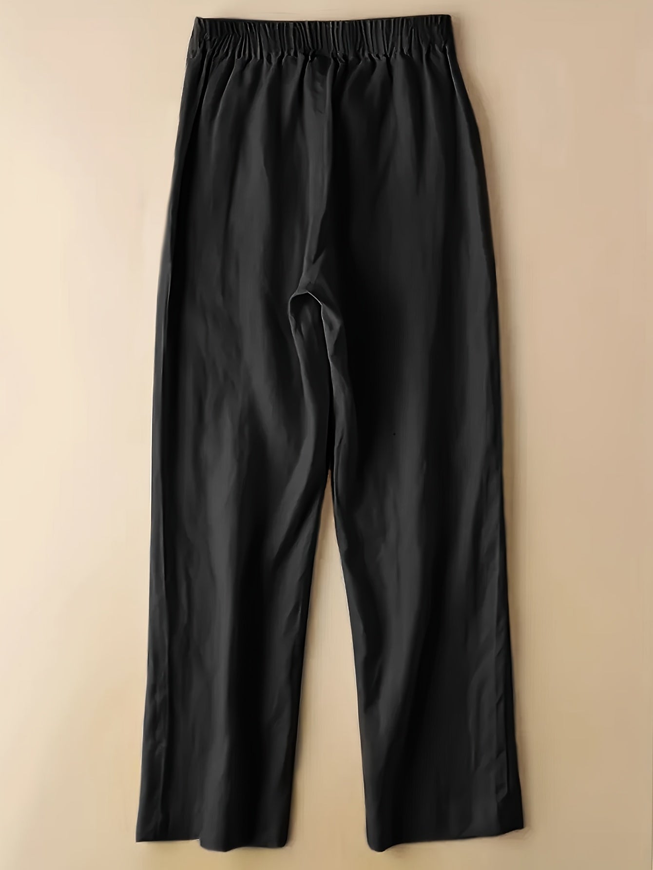 Elegant en Veelzijdig: Deze broek heeft een rechte pijp en een hoge taille met strik voor een flatterende pasvorm. De zwarte kleur zorgt voor een tijdloze en veelzijdige uitstraling die bij elke gelegenheid past.