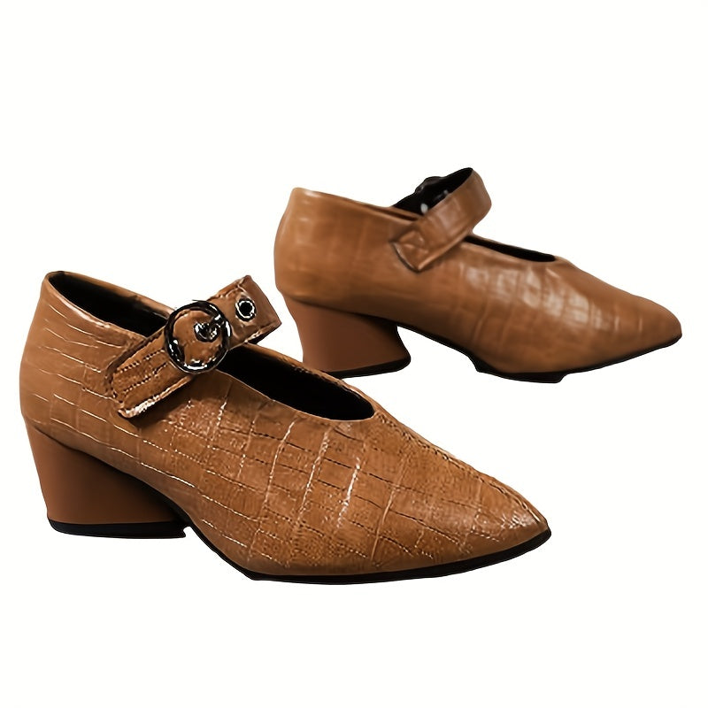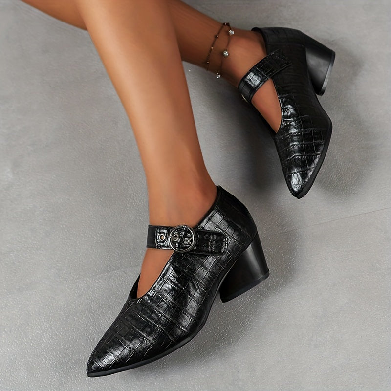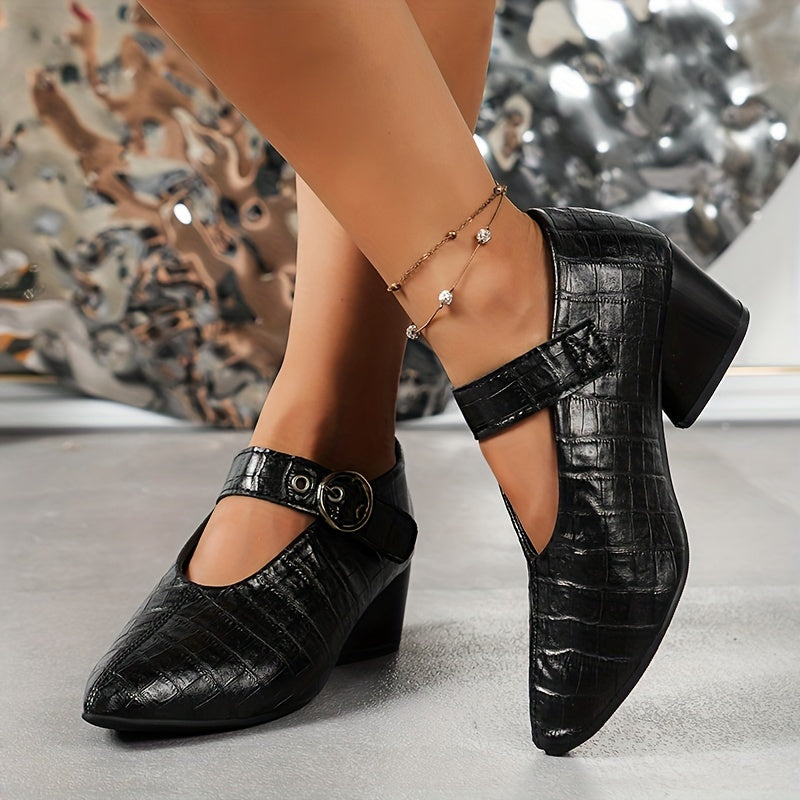 Elegantie en Comfort Onze pumps combineren een stevige, middelhoge hak met een puntige neus en een verstelbare enkelriem voor een elegante en comfortabele pasvorm. De solide kleur maakt het een veelzijdige keuze die bij elke outfit past.